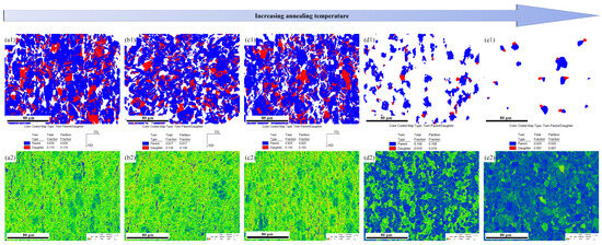Schematic diagrams of the proportion of twins and their parent phases: (a1) 450 °C/60 min/AC; (b1) 500 °C/60 min/AC; (c1) 550 °C/60 min/AC; (d1) 600 °C/60 min/AC; (e1) 650 °C/60 min/AC and KAM figures: (a2) 450 °C/60 min/AC; (b2) 500 °C/60 min/AC; (c2) 550 °C/60 min/AC; (d2) 600 °C/60 min/AC; (e2) 650 °C/60 min/AC in the alloy annealed at different temperatures.