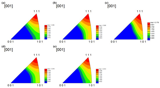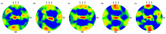 Pole figures (PFs) of the alloy annealed at different temperatures: (a) 450 °C/60 min/AC; (b) 500 °C/60 min/AC; (c) 550 °C/60 min/AC; (d) 600 °C/60 min/AC; (e) 650 °C/60 min/AC.