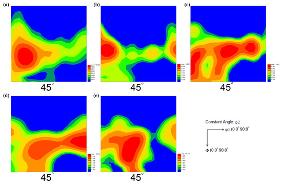 ODF sections in the Euler space with a constant φ2 = 45° of the Ti50Ni47Fe3 alloy tube annealed at different temperatures: (a) 450 °C/60 min/AC; (b) 500 °C/60 min/AC; (c) 550 °C/60 min/AC; (d) 600 °C/60 min/AC; (e) 650 °C/60 min/AC.