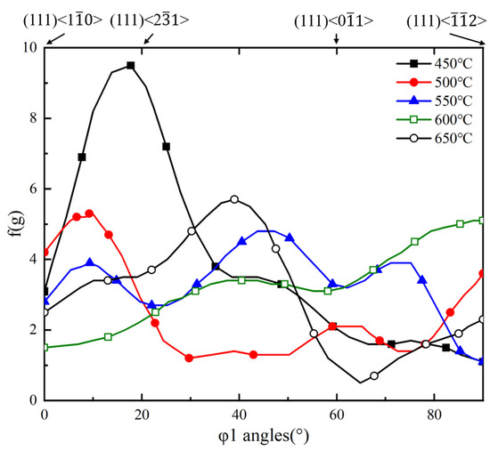 Figure 11 shows the ODF cross-section φ2 = 45° of the alloy after annealing at different temperatures. The main reason for selecting the ODF cross-section of φ2 = 45° for the texture observation is that this cross-section can easily display the most preferred orientations existing in the alloy [33]. The results show that the texture is mostly located on the γ orientation line (φ1 = 0–90°; Φ = 54.7°; φ2 = 45°). With the increase in the annealing temperature, the main texture of the alloy is (111)[uvw], distributed along the γ orientation line. The distribution map of the orientation intensity along the γ orientation line of the as-annealed alloy is shown in Figure 12 for convenient analysis. The f(g) is for the orientation density. The alloy has a strong single (111)[21] texture at 450 °C. When the annealing temperature is over 500 °C, the texture density decreases first and then remains unchanged. It can be seen that texture (111)<10> and texture (111)<2> exist when the alloy is annealed at 500 °C. A series of secondary textures, distributed along the γ orientation line, occurs when the alloy is annealed at 550 °C. This is to a certain extent similar to the conclusion obtained from a study on the microstructure and texture of a TiNi rolled plate [37]. Then, when the alloy is annealed at 600 °C, the main texture of the alloy transforms into (111)<2>. The texture of the alloy gradually transforms into a single texture. When the alloy is annealed at 650 °C, according to Figure 11e, it can be seen that the main texture of the alloy is (111)<11>, and the texture density is similar to the texture density (111)<2> when the alloy is annealed at 600 °C. According to the change in the orientation density in Figure 12, it can be seen that with the increase in the annealing temperature, the orientation {111}<110> decreased, and the crystal orientation of the alloy gradually turned to {111}<112>.
