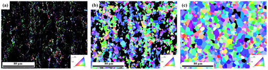 IPF figures of the recrystallized grains of the annealed alloys: (a) 550 °C/60 min/AC; (b) 600 °C/60 min/AC; (c) 650 °C/60 min/AC.