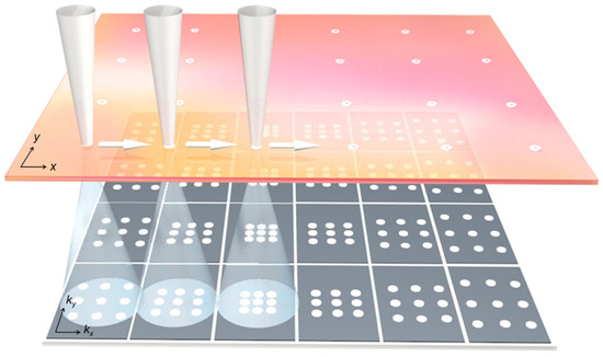 Cowley initially explored scanning electron nanodiffraction (SEND) [1], a method that captures electron diffraction data for each position scanned by the electron probe. However, this technique did not gain widespread adoption mainly due to the recording of diffraction patterns using taped videos, resulting in low-quality data. Analyzing information from these taped videos also posed significant challenges. In recent years, there has been a renewed interest in the same method, now referred to as four-dimensional scanning transmission electron microscopy (4D-STEM) [2,3], driven by advancements in electron detectors [4,5,6,7,8] and enhanced computational capabilities. The nomenclature 4D-STEM stems from its collection of a four-dimensional (4D) diffraction dataset, namely, the electron diffraction pattern in momentum space (kx, ky) for each probe position in real space (x, y) (see Figure 1).