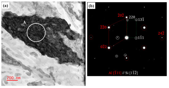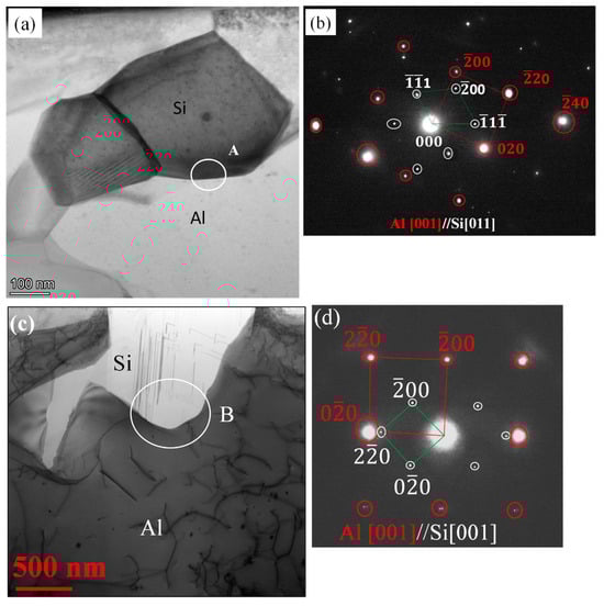 Similarly, Figure 1c,d shows the BF STEM image of the as-cast Al-20Si-0.2Sr eutectic alloy and the corresponding SAD pattern from the marked circle B, respectively. The diffraction pattern indicates an electron beam direction of //Al[001]//Si[001] with a 45° rotation of about [001], thus the OR is (Al//()Si and (Al//()Si, which is different from the one above for the unmodified as-cast Al-Si. On the contrary, Shamsuzzoha et al. [32] observed that the aluminum phase in the strontium-modified eutectic develops as elongated columnar grains parallel to the silicon fibers, exhibiting a pronounced <110> fiber texture. Nevertheless, no consistent orientation relationship was identified between the silicon and aluminum phases.