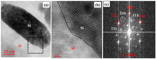 Additionally, a magnified view of the Al-Si eutectic microstructure in the case of LSR Al-20Si-0.2Sr is shown in Figure 5a, whereas one of the local interfaces highlighted by the dotted square is further enlarged in Figure 5b, focusing on the Al-Si interface-oriented edge with both crystals diffracting. The micrograph in Figure 5b represents a faceted interface between one Si fiber and the Al matrix, indicating a semi-coherent type. The Si phase is oriented along the <011> beam direction, whereas the Al phase is not on the zone axis, as indicated by FFT, since not all Al spots are present (Figure 5b). An analysis of the FFT (Figure 5c) confirmed a slight mis-orientation between the Al(111) plane and Si(111) plane (~10°) from the zone axes of <011>Al and <011>Si.
