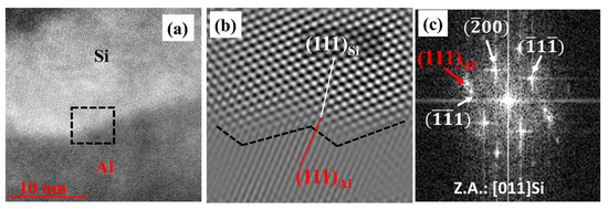 where dx and dy are the interplanar spacings for the planes x and y, respectively, and mx and ny are the integers, according to the relation, dx/dy = mx/ny. In general, in the coherent interface, dAl(111) = 0.2338 nm (PDF#00-004-0787) and dSi(111) = 0.3113 nm (PDF#01-080-0018), so nAl and nSi equal 3 and 4, respectively. This means that four (111) planes of Al match with three (111) planes of Si. Using these ratios, the minimum value of lattice strains calculated using Equation (2) for two different types of Al-Si interfaces observed experimentally (Figure 7 and Figure 8) is summarized in Table 2.