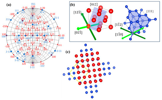 In the case of as-cast Al-Si and Al-Si-Sr alloys, our study confirms the OR of <001>Al//<011>Si and {012}Al//{}Si and the OR of <001>Al//<001>Si and {010}Al//{110}Si, respectively (Table 1). The stereographic projections and atom models generated using Vesta software (Version: 3.4.5) have been employed to elucidate the orientation relationship between various crystallographic planes, thereby corroborating the experimental observations. The stereographic projections following the parallel beam directions of ORs <001>Al//<011>Si observed in the as-cast Al-20Si eutectic alloy are shown Figure 6a. The atom models representing the {012}Al (left side denoted by red color atoms) and {111}Si (right side denoted by blue color atoms) planes are shown in Figure 6b. The boundary plane looking down from the {012}Al//{111}Si plane is shown in Figure 6c.