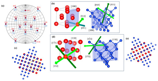 As-cast Al-20Si-0.2Sr alloy: (a) stereographic projection along the [001]Al//[001]Si direction, (b) atom models highlighting the {100}Al (left side denoted by red color atoms) and {100}Si (right side denoted by blue color atoms) planes, (c) corresponding interface plane looking down from {100}Al//{100}Si, (d) atom planes showing Al{110} and Si{110} planes, and (e) corresponding interface plane looking down from {110}Al//{110}Si.