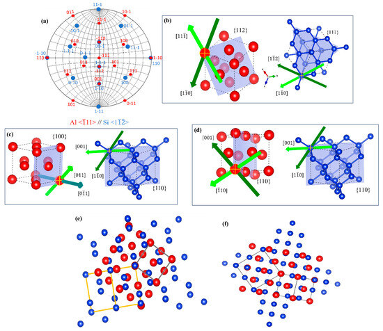 LSR Al-20Si alloy: (a) stereographic projection along the Al<111>//Si<112> direction, (b) atom models highlighting the (b) {112}Al (left side denoted by red color atoms) and {111}Si (right side denoted by blue color atoms) planes, (c) {001}Al (left side denoted by red color atoms) and {110}Si (right side denoted by blue color atoms) planes, (d) {110}Al (left side denoted by red color atoms) and {110}Si (right side denoted by blue color atoms) planes, (e) interface plane looking down from {112}Al//{111}Si, and (f) interface plane looking down from {001}Al//{110}Si.