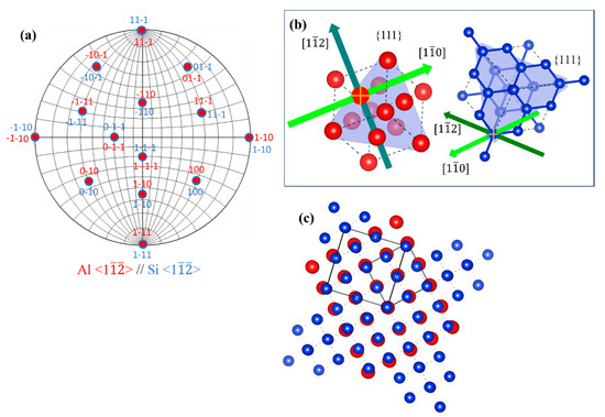 LSR Al-20Si-0.2Sr: (a) stereographic projection along the <112>Al//<112>Si direction, (b) atom models highlighting the {111}Al (left side denoted by red color atoms) and {111}Si (right side denoted by blue color atoms) planes, and (c) interface plane looking down from {111}Al//{111}Si.