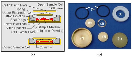(a) Synoptic diagram of dielectric measurement cell. (b) Photo of the open cell: (1) cell closing plate, (2) spring, (3) upper electrode, (4) Teflon isolation, (5) seal rings, (6) lower electrode, (7) cell carrier plate (reproduced from [36]).