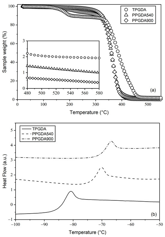 Figure 3a presents the TGA analysis results for TPGDA, PPGDA540, and PPGDA900. The figure shows that the TPGDA monomer degrades faster than the other monomers. It remains stable up to 140 °C, after which it degrades to 90% of its initial weight between 195 °C and 325 °C, followed by a second degradation. At 465 °C, the TPGDA monomer is almost completely degraded (2% of the initial mass). The initial degradation may be attributed to lower molar masses (see Figure 2b). The residual material (2%) observed at 465 °C can be linked to the presence of inorganic impurities. It is worth noting that the PPGDA540 monomer degrades at a slower rate than the TPGDA monomer. The substance remains stable up to a temperature of 152 °C, after which it undergoes a weight decrease until it loses 12% of its original weight at 313 °C. The material experiences rapid degradation, with complete degradation occurring at 327 °C. The degradation of 12% between 152 to 313 °C suggests the presence of inorganic impurities in the monomer, although less than in TPGDA monomer. The PPGDA900 monomer is the most stable of the three monomers, undergoing a slow decrease rather than a sudden drop. Its degradation begins at 221 °C and reaches total degradation at 443 °C. This monomer also contains inorganic impurities (see Figure 3a).