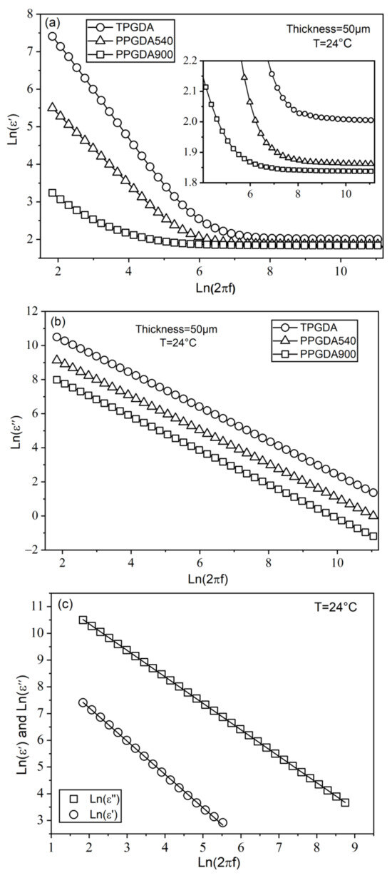 The static dielectric permittivity increases in the following order: PPGDA900, PPGDA540, and TPGDA. This can be explained by the higher dipole moment of TPGDA, which is caused by an enhanced volume density of carbonyl groups [7,8].