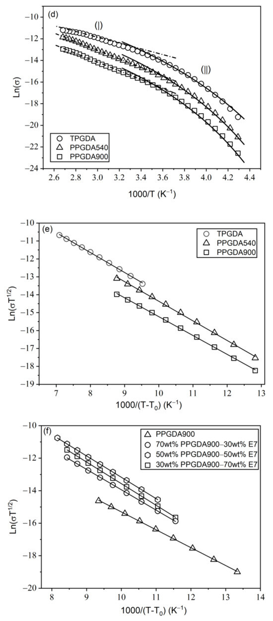 where is the absolute temperature; , and are the fitting constants; represents the Boltzmann constant; and stands for a pre-exponential factor, which is related to the number of charge carriers. is the pseudo-activation energy, and is the critical temperature (ideal glass transition) at which the conductivity becomes zero [43]. Typically, is set to be below . The values were obtained from DSC measurements. was calculated as = 40 K. Figure 4e,f show the plot of versus for the three monomers and the PPGDA900/E7 mixtures as examples. The data indicate a strong correlation between the VTF theory and the low-temperature data. However, in the high-temperature region (I), the curve deviates from the VTF equation. The transition from the VTF equation to the Arrhenius equation is clearly visible in this region. This behavior is commonly observed in polymer electrolyte systems. The data in region (I) can be fitted using the Arrhenius equation: