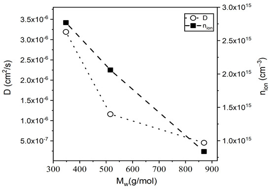 Figure 5 displays the relationship between the ionic concentration and the diffusion constant D, as a function of the molecular weight of the monomers at 24 °C. The plots show that as the molecular weight increases, both the ionic concentration and diffusion constant decrease. The decrease in the mobility of the monomer chain with higher molecular weight is likely responsible for the latter effect. The findings align with the thermal diffusion behavior observed in the binary aqueous solutions studied by Kishikawa et al. [44]. The relationship between D and the mobility (electrophoretic mobility) η is given by η. It can be inferred that the movement of the chain facilitates ionic migration towards the electrodes. The concentration of impurities in the monomers may be linked to the residues observed on the TGA analysis (inset of Figure 3a).