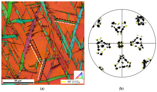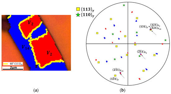 Figure 2b is the experimental pole figure of variants (red points) and (blue points) shown in Figure 2a. Three poles are in common between the two variants, as expected for crystal twin-related on the system. These poles are indicated by black arrows in Figure 2b. The and pole figures of the parent austenite are superimposed as yellow squares and green stars, respectively. It can be seen that none of the poles are parallel to any of the three common poles. This tends to confirm that the LIS of martensite does not correspond to a system. On the contrary, the pole is strictly parallel to the common pole /. Hence, a complete agreement with the experiments is obtained when considering that and are variants of the solution 3 of the PTMC with an LIS on . In the Supplementary Material Figure S1, a second example corresponding to area 2 in Figure 1b is given and similar conclusions are reached. In all the other cases investigated, the high shear solution of the PTMC, solution 3, is perfectly consistent with the experiments. Referring to Supplementary Material Table S1, and have almost parallel habit planes of the form , i.e., are close to . It can be checked that this HP is at 25° from the plane involved in the KS OR for and . This crystallographic feature is consistent with the previous studies on martensite [16,17]. Moreover, the plane, which is the plane of the LIS common to and , is nearly parallel to the habit plane of the macroscopic plate. This arrangement contrasts with the proposal made by Baur et al. in which the twinning plane of the LIS is at an angle of approximately 55° from the HP.
