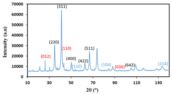 XRD diffraction patterns recorded with a diffractometer equipped with a Co source on Copr-ZFO-L64 = 1.8 g. Possible hkl values of diffraction peaks indexed, in black: cubic spinel ZnFe2O4, in blue: ZnO (hexagonal), in Red: hematite, α-Fe2O3.