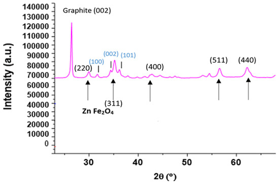 In addition, Figure 4 presents the diffractogram of the coprecipitated ZFO with added reduced GO (Copr-ZFO-RGO). A narrow peak attributed to the 002 diffraction of the carbon-based lattice, hexagonal and formed by hybridized sp2 carbon atoms in graphene, near 26°. The peak due to 3D graphite is rather observed at 27°. A heat treatment performed under argon at 450 °C instead of air was possible to keep the signature of C species. In that case, some new peaks of ZnO (cubic) were detected.