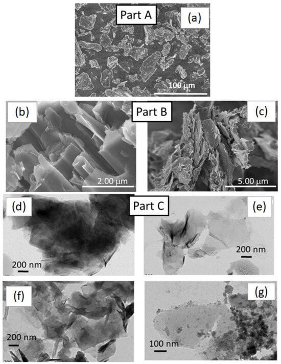 SEM and TEM micrographs, PART A: (a) SEM image of the commercial graphite sample, GP, large scale (100 μm), PART B: SEM image of the (b) commercial graphite powder, scale/50 (2 μm) to evidence thin sheets of C-species forming large cylinders (diameter: 250 nm in average, with a length of several microns) and the (c) same sample grinded. PART C TEM images: (d) image on a particularly thin nanoparticle present in the GP, a (e) particular thin GO particle obtained via a chemical method, the (f) same, then (d) after an ultrasound treatment, and (g) with the hydrothermal treatment HT-ZFO-GO nanoparticles.