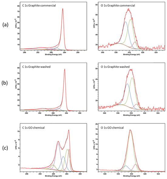 C 1s and O 1s regions as measured via XPS with three samples: (a) commercial graphite (GP), (b) GR washed, and (c) GO obtained via a chemical treatment (Pi-Pi* transition, i.e., bonding to antibonding transition).