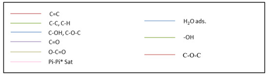 In Table 3, the XPS spectra obtained in five samples are compared. The three first samples in Table 3 correspond to (i) commercial GP, (ii) the same sample washed with water, and (iii) GO obtained via chemical synthesis. The described fourth and fifth samples were HT-ZFO and its equivalent after the dispersion via graphene as the GO species on it (still no heat treatment). The GO was transformed into RGO during an ultrasound treatment applied before to add Fe and Zn precursors.