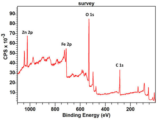 Survey XPS spectrum of the sample containing HT-ZFO uncalcined with indicated positions of the O 1s, C 1s, Fe 2p and Zn 2p peaks positions. A TEM image of this sample is presented in the graphical abstract. As indicated in the text, this sample contains small ZFO particles and a large amount of C species that were generated during the hydrothermal treatment performed in ethanol.