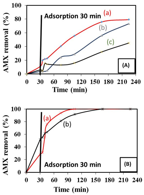Looking at the first 30 min of contact between the solid catalysts and the solutions containing AMX, the phenomenon observed is the spontaneous adsorption of AMX on the surface of the solids. It is more effective in the case of the solids prepared via the hydrothermal treatment (Figure 8A,B) than the samples prepared via coprecipitation.
