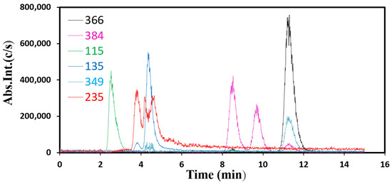 Representative HPLC curves of the [M-H+] fragments to detect fragments at 2.5, 4.4, 8.5, 9.7 and 11.3 min of elution.