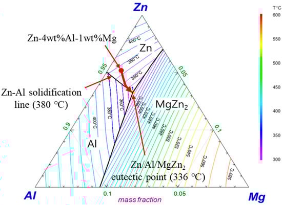 The cross-sectional microstructures of the Zn–Al–Mg–Si alloy coatings with different Si compositions are presented in Figure 1. In the coating without Si, a significant amount of Fe dissolved from the substrate during the dipping process and was incorporated into the coating layer, as shown in Figure 1a. This dissolved Fe led to the formation of Fe–Zn IMC layers between the alloy coating layer and substrate. In comparison, in the Si-added coating layers (Figure 1b–d), the formation of an Fe–Zn IMC layer was inhibited, leading to a significant reduction in the coating thickness. The average coating thicknesses for samples S0, S1, S3, and S5 were 99.1, 21.2, 17.4, and 16.9 µm, respectively. In the analysis of the coating layer without Si, it was difficult to differentiate between the IMC phases formed by the interactions among the Zn–Al–Mg alloy coating components. In contrast, various intermetallic microstructures, including Zn, Zn/Al eutectic, and Zn/Al/MgZn2 ternary eutectic structures, were observed in the Si-added coating layers of the samples. The formation of the MgZn2 binary eutectic phase was inhibited, which could be explained based on the temperature dependence of the solidification pattern exhibited by the Zn–Al–Mg alloy system. The Zn–Al–Mg ternary phase diagram shown in Figure 2 indicates that depending on the compositions of Al and Mg, microstructural phases such as Zn, MgZn2, and Al (Al-rich Zn/Al phase) can form during the solidification process. For the Zn-4 wt.%Al-1 wt.%Mg alloy system, solidification begins initially from the primary Zn phase, and as the temperature decreases to 380 °C, binary eutectoid structures of Zn/Al start to form. Subsequently, the final solidified state leads to the development of a ternary eutectic structure—Zn/Al/MgZn2—at 336 °C [21].