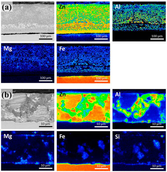 The corresponding electron probe microanalysis (EPMA) phase maps of samples S0 and S3 are displayed in Figure 3a,b, respectively. The EPMA results are consistent with the SEM data. The phase maps of S0 indicate that a significant amount of Fe is out-diffused and distributed inside the coating layer. However, the Fe content in the coating layer in sample S3 was significantly lower than that in sample S0. These results suggested that the dissolved Fe was in the solid solution along with the Si present in the Zn–Al and Zn–MgZn2–Al alloy phase regions. In Figure 3b, Al is predominantly observed in the Zn–Al binary eutectic phase and at the interface, whereas Mg is detected in the ternary eutectic phase and near the surface. In addition, Si is prominent at the interface and coating surface. These results confirm the formation of a stable FeAl3Si interlayer and its ability to inhibit the formation of a brittle Fe–Zn IMC layer.