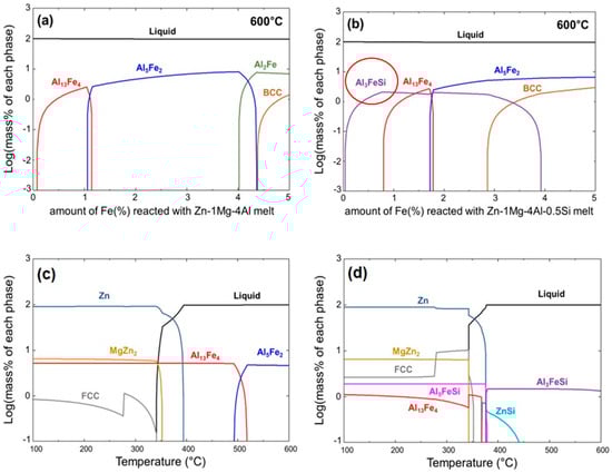 Figure 4 presents the calculated phase diagrams and solidification behavior of the Zn-4%Al-1%Mg ternary alloy with and without Si addition; these diagrams and results were obtained using FactSage. Figure 4a,b illustrate the alloy phases formed as the Fe content varied from 0 to 5 wt.% when the steel sheet was immersed in molten Zn-4%Al-1%Mg and Zn-4%Al-1%Mg-0.5%Si at 600 °C, respectively. In the absence of Si, various Al–Fe IMCs formed in all the composition ranges. However, for the coating containing 0.5 wt.% of Si (Figure 4b), the Al3FeSi IMC formed when the Fe content was <4 wt.%. Figure 4c,d show the phase transformation behavior when the molten alloys with compositions of Zn-4 wt.%Al-1 wt.%Mg and Zn-4 wt.%Al-1 wt.%Mg-0.5 wt.%Si were solidified by cooling from 600 to 100 °C. For the calculations, Fe contents of 2 and 0.5 wt.% were selected to represent conditions wherein significant Fe alloying occurred owing to the absence of Si and where Fe dissolution was impeded by the addition of Si, respectively. As shown in Figure 4c, in the absence of Si, the Fe2Al5 IMC forms at the interface immediately after the immersion of the steel in the molten bath. In contrast, with the addition of 0.5 wt.% of Si, primarily Al3FeSi IMC phases form at the interface, as shown in Figure 4d. The corresponding solidification onset temperature was slightly lower than that of the without-Si sample, leading to a narrower mushy zone.