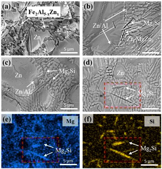 Figure 5 shows surface images of the Zn-4%Al-1%Mg alloy coating layers with and without Si addition. The presence of primary Zn, dendritic Zn/Al eutectoid, and Zn/Al/MgZn2 ternary eutectic structures on the surface aligns with the previous cross-sectional observations. In the Si-free coating layer shown in Figure 5a, granular polyhedral Fe2Al5−xZnx IMC particles, which were identified through XRD analyses, were observed on the surface. However, in Figure 5b–d, in addition to the Zn/Al/Mg alloy phases, needle-shaped IMCs are evident on the surface of the Si-containing coatings. EDS mapping was conducted on sample S5 to determine the Mg and Si distributions, and the corresponding results are shown in Figure 5e,f, respectively.