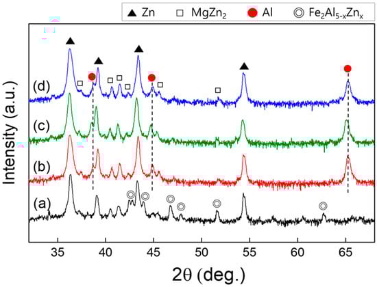 High-resolution XRD analyses were performed to evaluate the effects of the Si content on the crystallographic properties of the Zn–Al–Mg–xSi alloy coatings, and the corresponding patterns are shown in Figure 6. In the patterns of the Si-containing coating layers, distinctive peaks corresponding to Zn, Zn/Al eutectoid, and Zn/Al/MgZn2 eutectic structures, such as Zn, MgZn2, and Al phases, were identified. Conversely, in the pattern of Si-free coating, numerous peaks associated with Fe2Al5−xZnx phases were observed, in addition to peaks corresponding to Zn and MgZn2. This result is attributed to the absence of Si, which results in a reaction between Al and the Fe dissolved from the substrate, leading to the formation of an Fe2Al5−xZnx alloy phase. No peaks associated with the Mg–Si alloy phase were detected in the pattern of the Si-containing coating layers, probably owing to the insufficient quantity of the Mg–Si alloy.