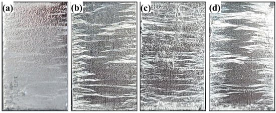 Photographs of the Zn-4 wt.%Al-1 wt.%Mg alloy coatings: (a) S0, (b) S1, (c) S3, and (d) S5.