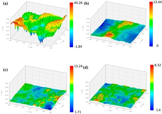 3D surface topographies of (a) S0, (b) S1, (c) S3, and (d) S5.