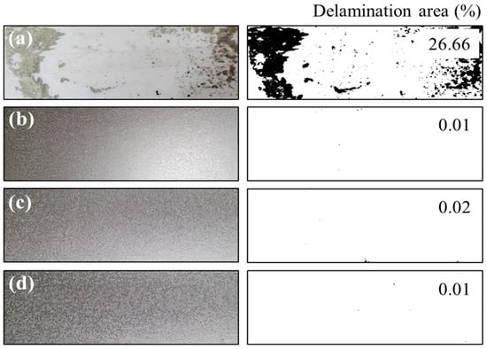 Coating-adhesion evaluation with an attached tape (on the left) and the corresponding peeled-off area fractions (on the right) for (a) S0, (b) S1, (c) S3, and (d) S5.