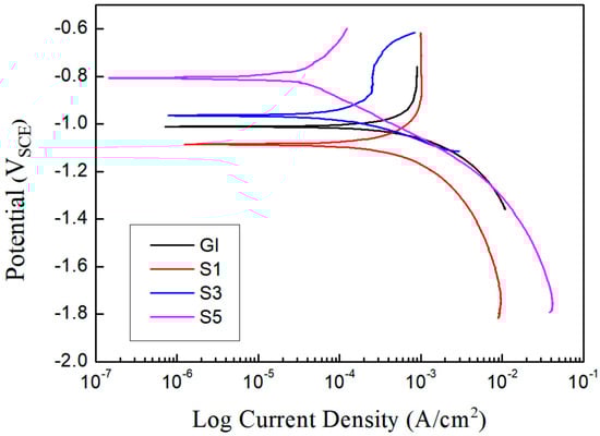 Potentiodynamic polarization plots of the hot-dip Zn–Al–Mg–xSi alloy-coated steel sheets.