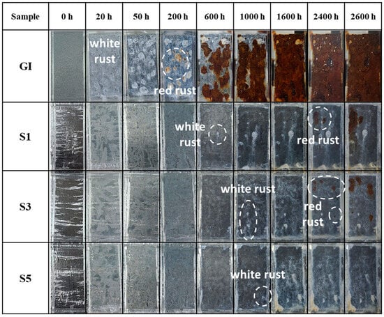 An SST was conducted to evaluate the corrosion resistance of the Zn–Al–Mg–xSi alloy-coated steel sheets. A GI steel sheet was also tested for comparison, and sample S0 was excluded from the evaluation because of coating delamination. Figure 12 shows that the corrosion resistances of all the Zn–Al–Mg–Si coatings were significantly higher than those of GI. White rust was observed over the entire surface of the GI steel after 20 h, and red rust began to appear after 200 h. In contrast, on the Si-containing alloy-coated samples S1, S3, and S5, white rust formed after 600, 1000, and 1000 h, respectively, indicating the occurrence of delayed white rusting in these samples. After 2400 h, red rust began to appear on the surfaces of S1 and S3, whereas sample S5 did not show the formation of red rust even after 2600 h. These SST results align with the electrochemical potentiodynamic polarization results, demonstrating that SI addition increases the corrosion resistance of the coatings.