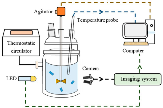 In this study, β-form LGA seeds were employed during the crystallization to suppress secondary nucleation and prevent the formation of little particles. It is worth noting that seed crystals were generated with β-form LGA crystals through milling, sieving, dissolving, and drying, etc. Initially, a 0.6 L LGA solution was poured into the vessel, and the stirring rate was set at 210 rpm. The solution was heated to 75 °C to dissolve all the LGA solutes. Subsequently, the temperature was gradually reduced to 45 °C at a rate of 0.5 °C/min. When the solution reached 45 °C, the crystal seeds were introduced into the crystallizer. Simultaneously, the online images were captured via the imaging system during the crystallization process, as shown in Figure 1. The solution was then cooled down to a temperature of 35 °C, at a cooling rate of 0.1 °C/min. During the experiment process, with one camera taking about six images per second, the non-invasive imaging device was able to collect 12 images per second.