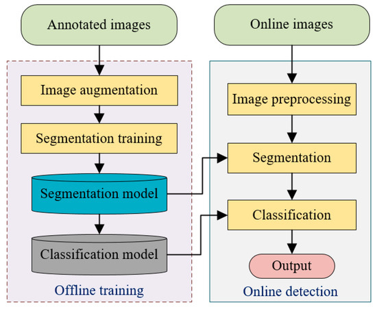 An overview of the presented detection strategy is described in Figure 2. As shown in Figure 2, the method involves two stages (i.e., offline training and online detection) employed to capture crystallization images in complicated situations (e.g., unbalanced illumination, solution movement, etc.). The first stage involves training the network parameters using the annotated images, followed by image augmentation. It is worth noting that the annotated image set includes the original images and the mask ones via manual labeling of the crystals. In the second stage, the online crystallization images, which are captured in real-time during the crystallization process, are segmented using the trained model after image preprocessing. The classification of the crystals can be completed for the segmented images.