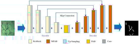 Although the deep learning network based on skipping joins can capture rich semantic features, it does not delineate the spatial and channel interdependencies among pixels, which are crucial for the segmentation of crystal images. In addition, the pixel equivalent is always defined by using clear crystal imaging, so fuzzy images of crystals can affect the extraction of clear crystals. For instance, overlapping or adhesion results are always misjudged, as shown in Figure 3. With the purpose of resolving the aforementioned problems, MANet is introduced, which needs a considerably smaller training set of crystallization image samples that have similar structures. An overview of the segmentation MANet model is shown in Figure 4. The model includes two parts, i.e., the encoder and decoder. In order to better obtain a large amount of useful multi-scale information in feature maps, MANet incorporates two attention layers known as the position-wise attention block (PAB) and the multi-scale fusion attention block (MFAB), which enhance the overall performance of the network. The PAB layer is designed to grab spatial dependencies among the pixels in a feature map using the attention mechanism. The MFAB layer is designed to grab channel dependencies across all feature maps using the attention mechanism. The MFAB layer not only obtains the channel dependencies in deep feature maps, but also obtains those in shallow ones.