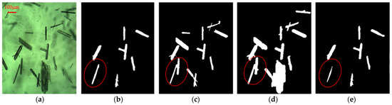 In addition, to indicate the superiority of the proposed image processing method for crystallization image analysis, the improved model, the thresholding segmentation method, the multi-scale segmentation method, and the original MANet model were used for comparison. The four segmentation methods are applied to the preprocessed crystal image shown in Figure 7a. Figure 7b shows the result with the improved MANet model. Figure 7c,d shows the result for the thresholding and multi-scale Canny segmentation methods, respectively. It is seen that the clear crystals are effectively extracted by the recommended technique for crystal classification, which can overcome the influence of crystal overlapping, while the two traditional techniques exhibit various shortcomings, such as the occurrence of fuzziness and the overlapping of crystals delineated by a red circle, as exhibited in Figure 7c,d. In addition, Figure 7e illustrates that the outcome generated by the original MANet model is less accurate when compared to that of the improved network. It is indicated that the improved MANet model can generally obtain clear particles to facilitate crystal classification for defect detection, as shown in Figure 7.