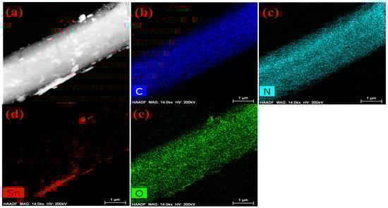 EDAX mapping images of melamine cyanaurate microrods adorned with SnO2 quantum dots (MS): (a) melamine cyanaurate microrods decorated with SnO2 QD morphology image, (b) carbon mapping image, (c) nitrogen mapping image, (d) tin mapping image and (e) oxygen mapping image.