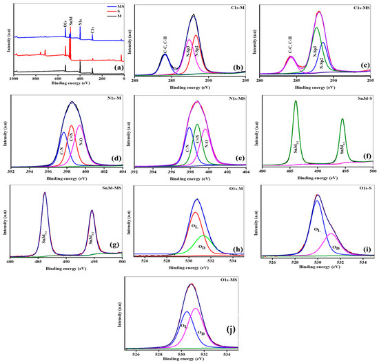 (a) XPS survey of samples of melamine cyanaurate microrods (M), SnO2 nanostructures (S), and melamine cyanaurate microrods adorned with SnO2 quantum dots (MS); (b,c) core XPS C1s spectra; (d,e) core XPS N1s spectra; (f,g) core XPS Sn3d spectra; and (h–j) core XPS O1s spectra.