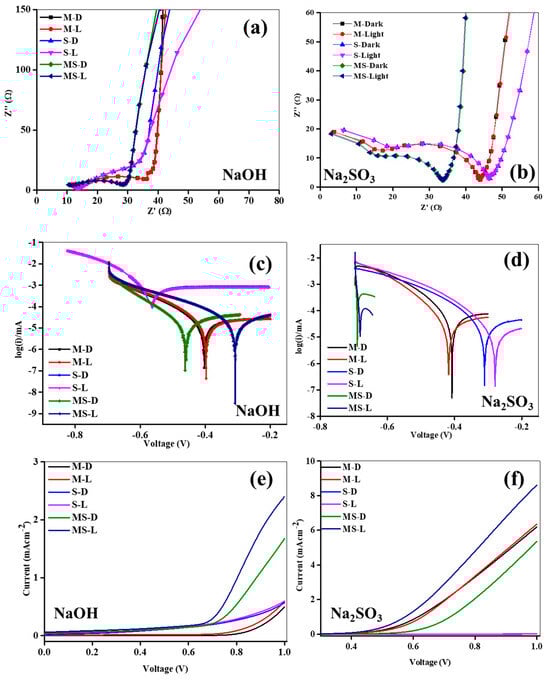 (a,b) Impedance analysis of sample electrodes of melamine cyanaurate microrods (M), SnO2 nanostructures (S), and melamine cyanaurate microrods adorned with SnO2 quantum dots (MS) under dark and light conditions in 0.1 M NaOH and Na2SO3 electrolytes; (c,d) Tafel analysis of sample electrodes of melamine cyanaurate microrods (M), SnO2 nanostructures (S), and melamine cyanaurate microrods adorned with SnO2 quantum dots (MS) under dark and light conditions in 0.1 M NaOH and Na2SO3 electrolytes, and (e,f) linear voltammetry of sample electrodes of melamine cyanaurate microrods (M), SnO2 nanostructures (S), and melamine cyanaurate microrods adorned with SnO2 quantum dots (MS) under dark and light conditions in 0.1 M NaOH and Na2SO3 electrolytes.