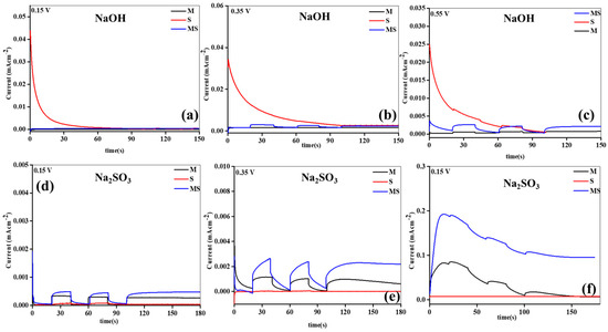 Furthermore, an examination of the effects of given potential, swapping dynamics, and solidity of the developed electrodes was conducted through amperometry in different electrolytes. The outcomes are illustrated in Figure 5a–f. The photoelectrodes displayed discernible variations in photocurrent generation in both electrolytes at altered given voltages. Notably, the Na2SO3 electrolyte revealed higher maximum photocurrents compared to the NaOH, attributed to enhanced interfacial interaction. The order of created currents at different applied potentials in both electrolytes was as follows: 0.15 V < 0.35 V < 0.55 V. Across all voltages, MS consistently demonstrated the highest photocurrent, surpassing the other anodes. In particular, at 0.35 V in the Na2SO3 electrolyte, the utmost induced current of 3 mAcm−2 was detected, outperforming other samples under varied states. The swapping and steady performances of the samples were more pronounced in the Na2SO3 than in the NaOH electrolyte. In the NaOH, no switching was observed at lower applied potentials, while at 0.35 V, switching occurred across all synthesized electrodes. Conversely, in the Na2SO3 electrolyte, clear switching activity was evident at lower applied potentials owing to upgraded interfaces. MS demonstrated distinct swapping and steady performances, coupled with the uppermost currents related to M and S. The superior performance of MS might be attributed to its enhanced capture capacity, higher electrode properties, Tafel slopes, established junction interface, ion-conduction paths, and inferior resistance parameters and recombination rates.