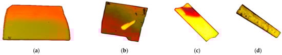 Microscopic images of complexes 4–7: (a) plate-like crystal 4; (b) plate-like crystal 5; (c) plate-like crystal 6; (d) plate-like crystal 7.