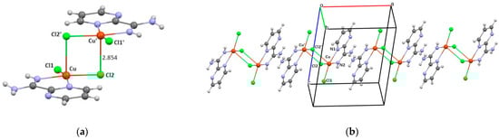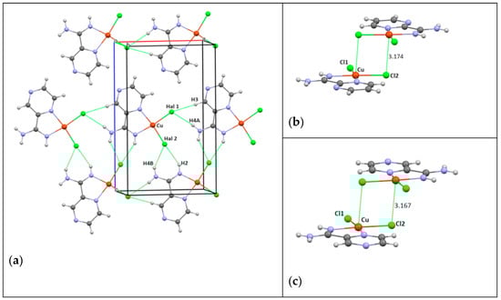 The general presentation of molecular positions in layers in crystals 4–7 is shown in Figure 3a. The structure of this layer is defined by short contacts of Cl…H type (Table 3) which are shorter than the sum of van der Waals radii of Cl/Br and H atoms by approximately 0.3–0.5 Å [] depending on which van der Waals radii system is used. The simple explanation of such short contacts is electrostatic interactions between positively charged H and negatively charged Cl atoms (see Figure S10). It should be mentioned that in these structures it is possible to observe relatively short contacts between complexes in molecular layers. In Figure 3b,c, molecules from different layers connected by inversion center are presented. For these molecules, it is possible to speculate that Cu atoms have a trend to increase their coordination number from 4 to 5 by including into their coordination sphere additional Cl atoms from neighboring molecules and forming a square-pyramidal environment with long axial metal–ligand distance. Distances between Cu and Cl at the vertex of the square pyramid are shown in Figure 3 for molecules 4 and 6 and for molecules 4–7 in Table 3.