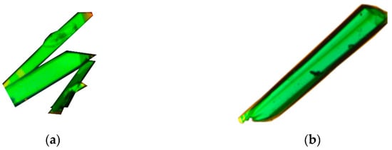 Microscopic images of green rod-like crystals of complexes 8 (a) and 9 (b).