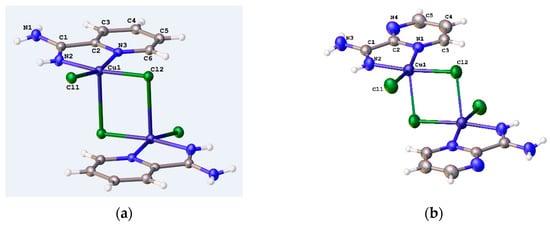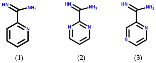 To increase the number of potential prototypes of pharmaceutical materials that can serve as imaging agents during MRI procedures, we synthesized and characterized several Cu(II) complexes with three ligands: pyridine-2-carboximidamide (1), pyrimidine-2-carboximidamide (2) and pyrazole-2-carboximidamide (3) (Scheme 1 and Scheme 2). As MRI contrast agents, Cu(II) complexes are much less studied because of their low total spin (S = ½), but they bring unique opportunities, as Cu(II) can be reduced to a diamagnetic state, allowing building contrast agents that can be turned off and on. Antimicrobial and antiviral activities of pyridine, pyrimidine, and pyrazole derivatives are also discussed in the literature [,,]. These prototype materials can help us to figure out possibilities of the formation of similar metal complexes with other metals utilizing ligands which we used in this study. It is known that such ligands can form different types of chelate complexes using active N atoms in heterocycles and carboximidamide groups []. In addition, two different halogens, Cl and Br, were used for complex formation. Corresponding to reaction conditions and reagents used for complex synthesis, the number and position of chelate ligands can differ, so it was important to support data on their structure using X-ray analysis. From the literature, it is known that, in many cases, variation of halogen in haloorganic crystals brings on the formation of isostructural crystals [,,,,,,]. The existence of isostructural solids gives a serious lead to the search for materials (in our case pharmaceutical materials) with similar properties that allow us to find the best representatives in the series studied for further applications.