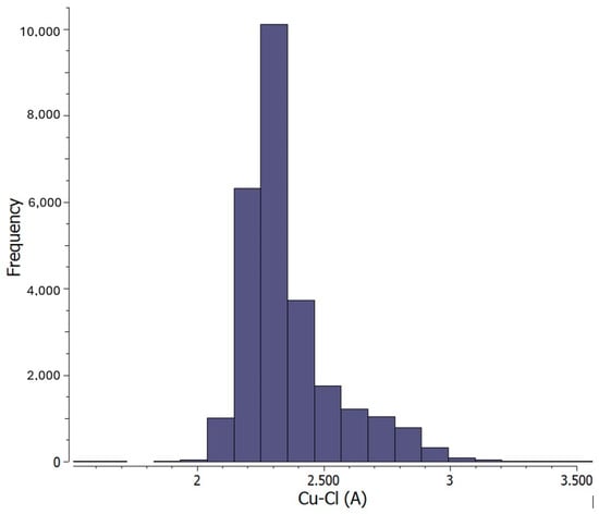 Histogram of Cu-Cl distances (Å) from CSD. A CSD search was conducted for all the structures with a Cu-Cl bond, with the only parameter used being the Cu-Cl distance. The search included all the oxidation states of copper, and the coordination number was not restricted. None of the elements were excluded from the search, so the search included ligands with atoms other than nitrogen. The version of the CSD used was 2023.1.